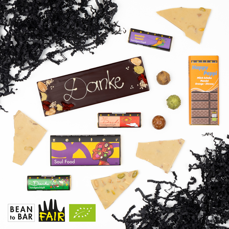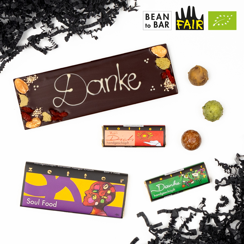 It's always a great time to say thank you! Nothing says it better than these 7 flavors of chocolate: Close your eyes and savor an edible "Thank You," a delicious little bar filled with a soft layer of almond marzipan and a nutty layer of classy almond praline. A beautiful "Thank You" dark chocolate bar that has been lovingly decorated by hand shows a personal touch. No matter the occasion, "Soul Food" is always the right chocolate bar to give as a present, and little Endorphin bonbons are the perfect nibble for a quick delight. 100% ORGANIC & FAIR.
