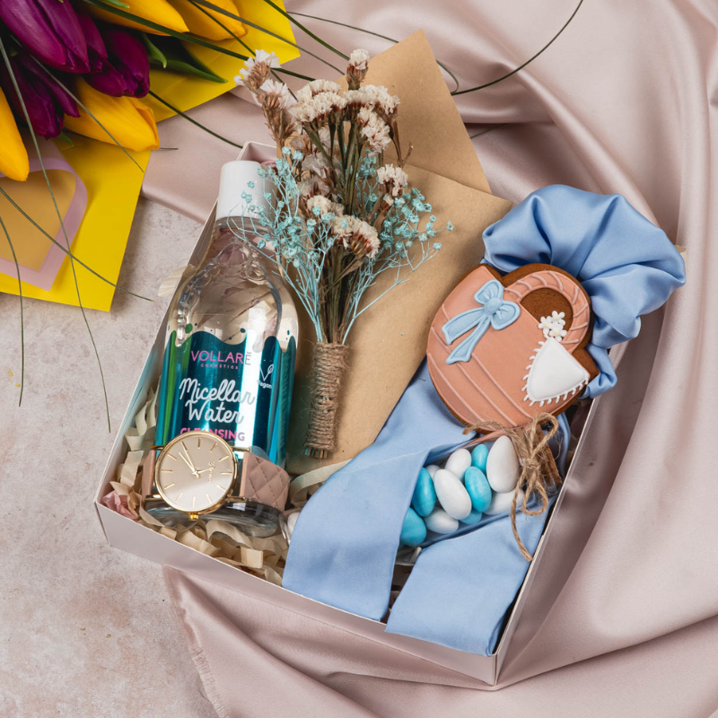 Here's a delightful ensemble of indulgence and convenience. This gift includes the refreshing Micellar water, Vollare in 300ml bottle for effortless cleansing. Plus, a chic scrunchy for stylish hair accessorizing, alongside a delectable cookie for a sweet treat. Indulge further with 50g of tantalizing dragee and a luxurious bar of chocolate. Lastly, adorn your wrist with a sleek watch, completing this box with a touch of timeless elegance.