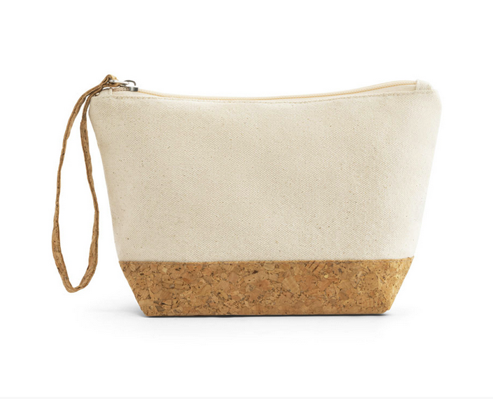 The Elite Necessaire combines practicality with style, featuring premium 100% cotton construction (280 g/m²) and distinctive cork detailing at the base for an eco-conscious touch. Its zip closure includes a functional strap that serves as a convenient carrying handle for on-the-go use.