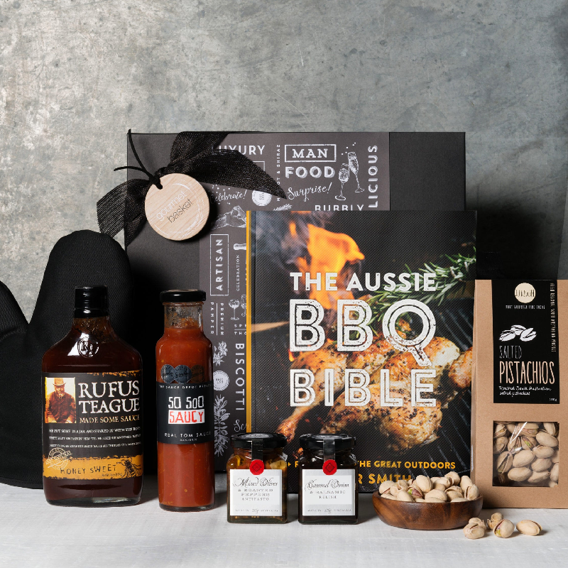 Whether you're a grill novice or a seasoned master, this gift box is sure to take your outdoor cooking experience to the next level. It includes "The Aussie BBQ Bible" by Oscar Smith, providing inspiration and tips for the grill. Along with the essential Oven Mitt (colours may vary), it features a delectable selection of sauces, such as Rufus Teague Honey Sweet Barbeque Sauce and The Sauce Depot So Soo Saucy Real Tomato Sauce. To complement the grilling delights, there are also Ogilvie & Co. Mixed Olives, Roasted Peppers Antipasto, Caramel Onion, and Balsamic Relish, as well as Port Willunga Fine Foods Salted Pistachios for a delightful snacking experience.