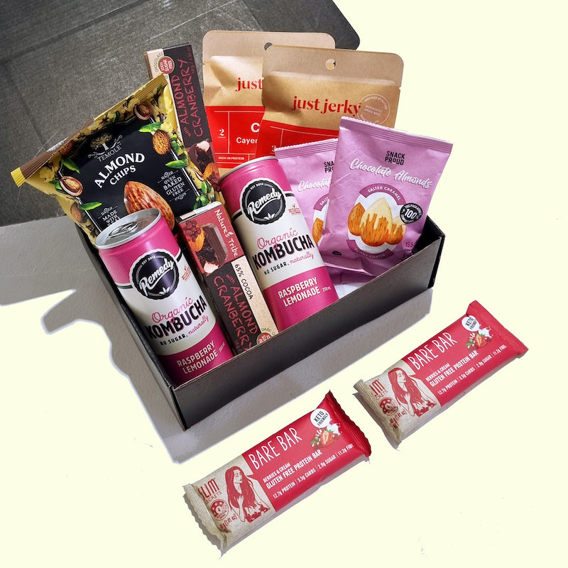 If you are looking for a gift for him or maybe your special lady who happens to be keto or gluten-free, we got you covered. This keto gift box is full of delicious, snacks and drinks that will be perfect in front of a movie or to take on a weekend getaway or picnic. Carefully selected for being low in net carbs, enjoy sweet and savory products like Salted Caramel Skinny-Coated Almonds, Nature's Tribe Cranberry Dark Chocolate Bars, Just Jerky grass-fed-beef jerky, and Remedy Kombucha.