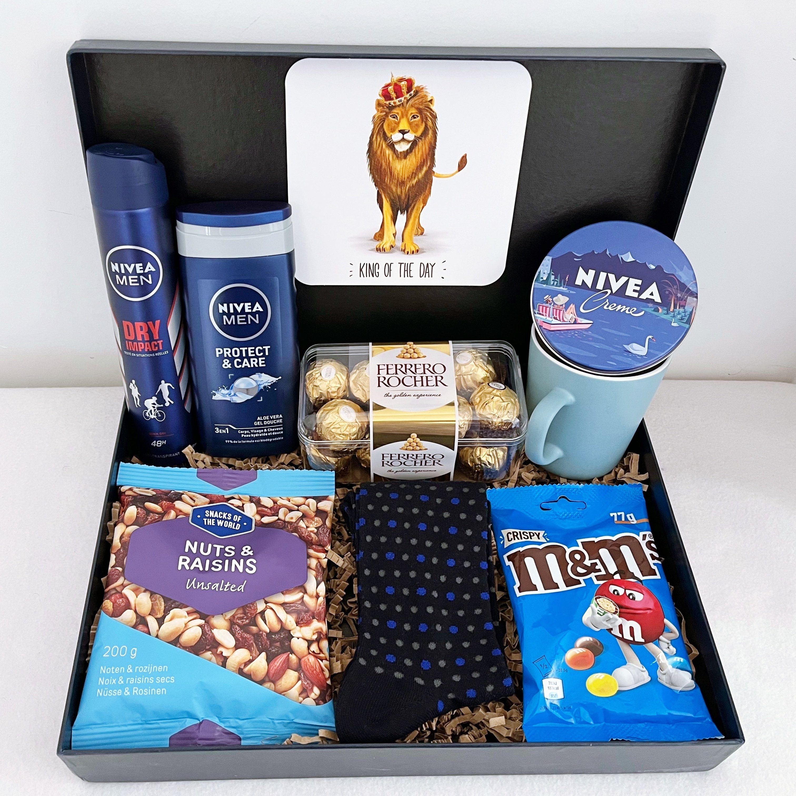 Every king has his needs! Get this pamper box for men to relax and unwind. Coming in a carefully crafted gift package, this box contains a Nivea shower gel and deodorant, Ferrero Rocher chocolates, men's socks, and many more. He will appreciate the care put into this box.