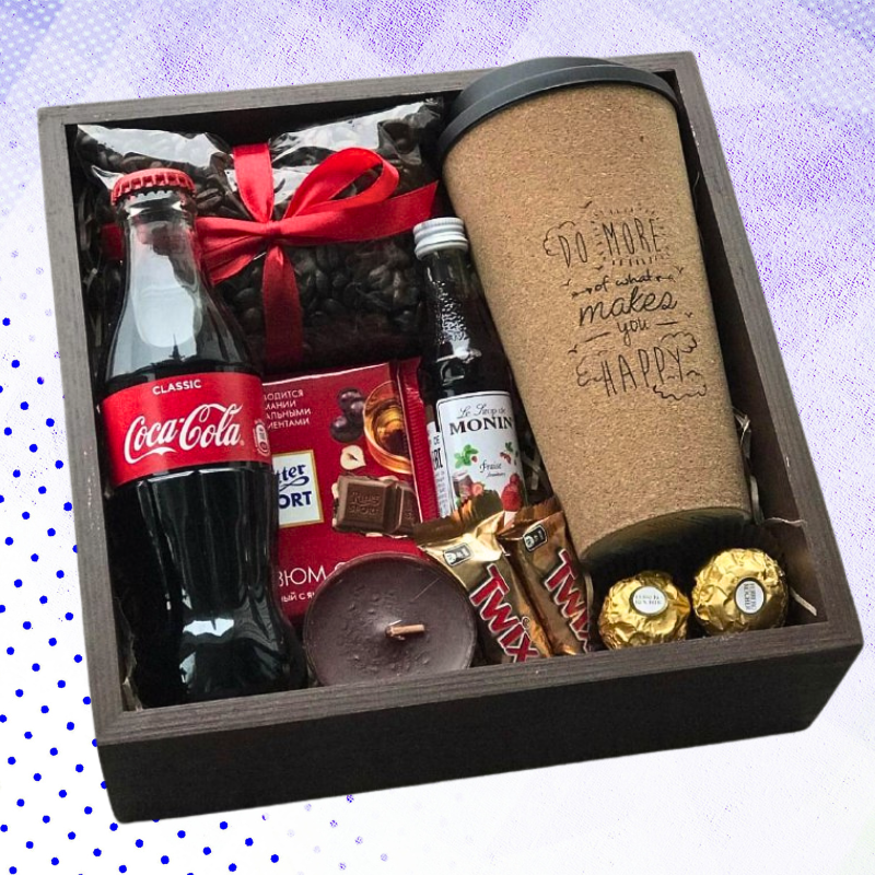 It's the best combination of a great day to sip coffee and a sweet treat to enjoy. This gift set is the best for true connoisseurs of fragrant and delicious coffee. The gift set contains an elite grade of coffee beans, a craft-style thermo cup, magic strawberry syrup for coffee, which will make it even tastier and more fragrant, a bottle of Coca-Cola, chocolates, and delicious sweets such as Twix and Ferrero Rocher, as well as a fragrant candle to set up the mood.