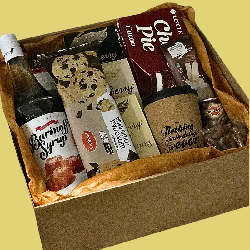 Presenting this box to all coffee lovers who are inspired and productive all day long with caffeine & refreshing companions. This set contains assorted cookies, chocolate, and nuts, and enjoy it with a hot drink - tea or coffee. Offering you black Ceylon, milk Oolong, fruit, and 500g of premium quality coffee beans. A lovely thermocup and a liter of delicious coffee syrup complete the set. It's a good day to be inspired with coffee and tea by your side.