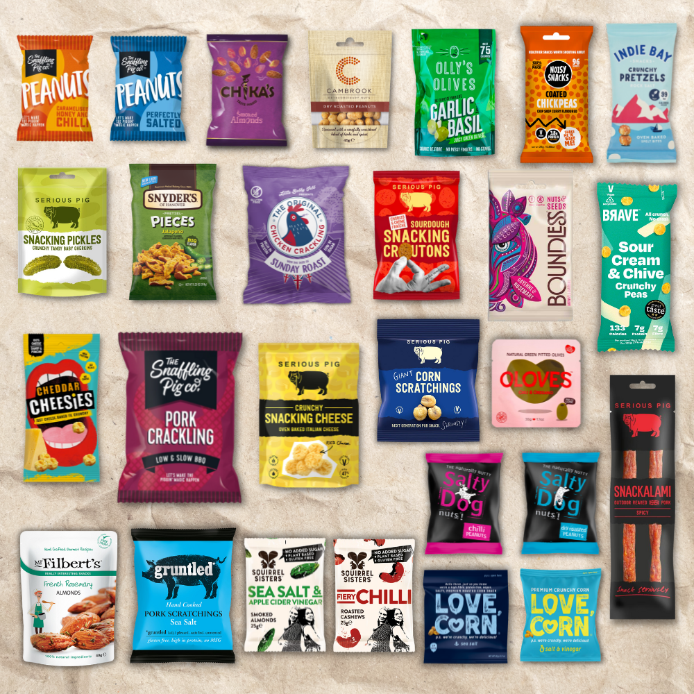 Containing full-size, single-serve premium snacks, this box is the perfect accompaniment to an ice-cold Pilsner or IPA. Whether you're catching up with friends over a cold one or settling down for a weekend movie with the family, this box is perfect for those looking for the best in premium pub snacking! Including favourites like Snaffling Pig's Low & Slow BBQ Pork Crackling, or something for those a little more adventurous, such as Chicken Crackling, and Crunchy Popped Cheese Bites. To ensure the environment is cared for, the boxes are sustainable, made from 90% recycled materials, and no bubble wrap or plastic is used for packaging up the snack boxes.