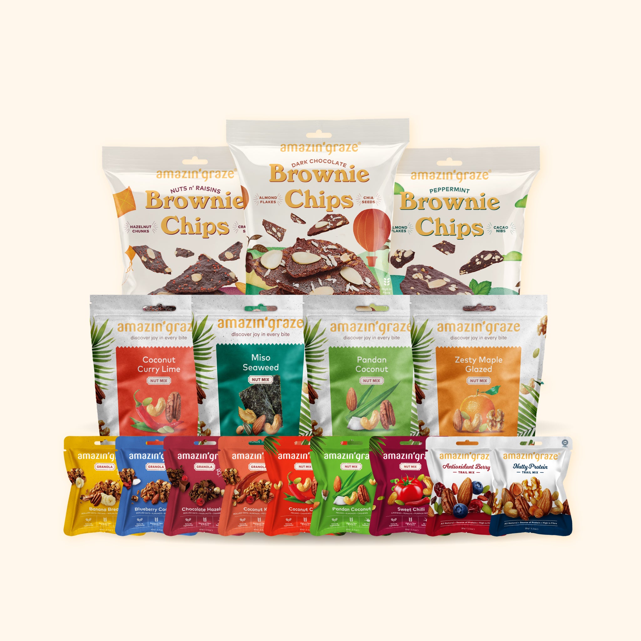 Embark on a new and better snack adventure with this party bundle featuring various best-selling treats to share with your loved ones. Delight in brownie chips with nuts & raisins, peppermint flavours alongside Granola Bites in chocolate hazelnut, blueberry coconut, coconut kaya, and banana bread textures. Savour nut mixes in curry lime, sweet chili, antioxidant berry, and pandan coconut, perfect for a festive gathering. Keep the party going into the night with pandan coconut, coconut curry, miso seaweed, and a zesty twist to elevate your celebration.
