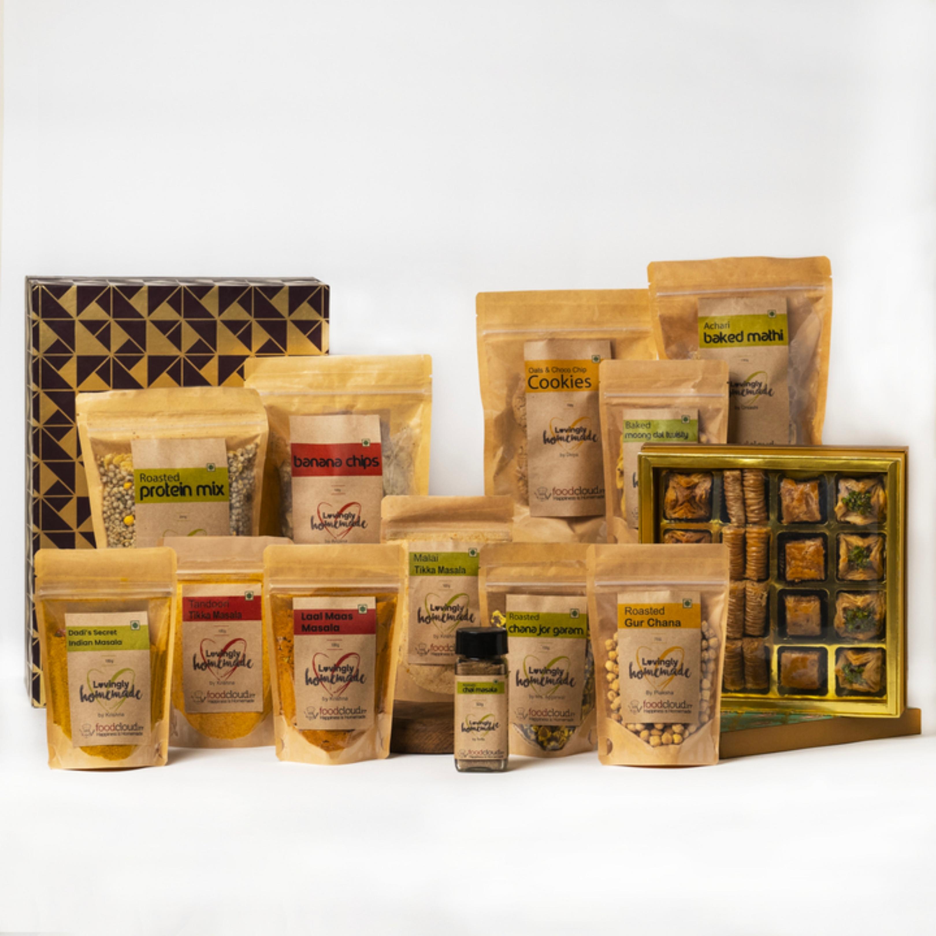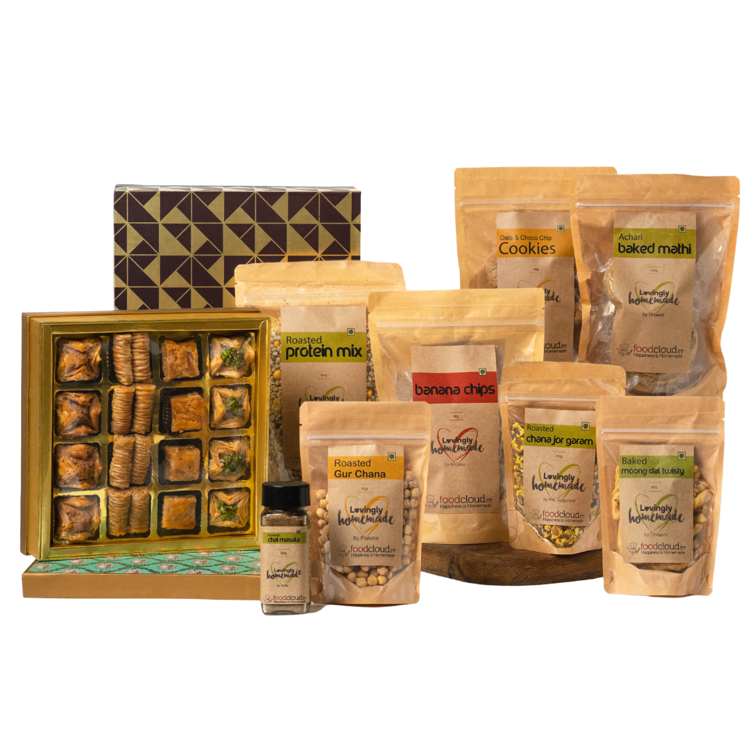 Here comes a hamper that is perfect For tea time treats. A pinch of chai masala will transform your tea into a cup of deliciousness. This secret spice blend is perfect even for the summers! Enjoy freshly baked & roasted homemade snacks like mathi, moong dal twisty, banana chips, and many more that will transform your everyday tea time into a treat time! A box perfect for tea lovers, great as a gift, or just for you to enjoy at home.