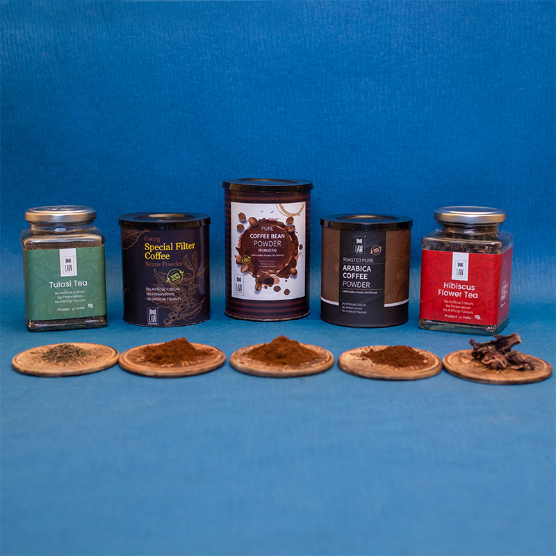 Love enjoying both tea & coffee? Then we have it all for you! Presenting the best from the hills of Assam and the valleys of Nilgiris and Munnar. Organically grown and processed hygienically, they come in beautiful packaging and stay fresh for a long time. The box comes with a range of different flavors of tea & coffee. You shall find Arabica coffee powder, Robusta coffee powder, and Coorg filter coffee powder along with distinct tea flavors like hibiscus tea, and tulsi tea. This box is a one-stop solution for those who love tea and for those who enjoy coffee!