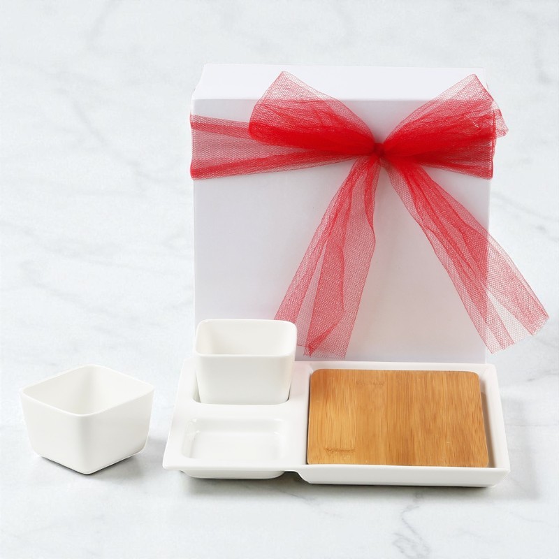 This elegant 4-Piece Cheese Serving Set includes a ceramic tray, two square bowls, and a bamboo cutting board, making it perfect for serving cheeses and accompaniments in style.