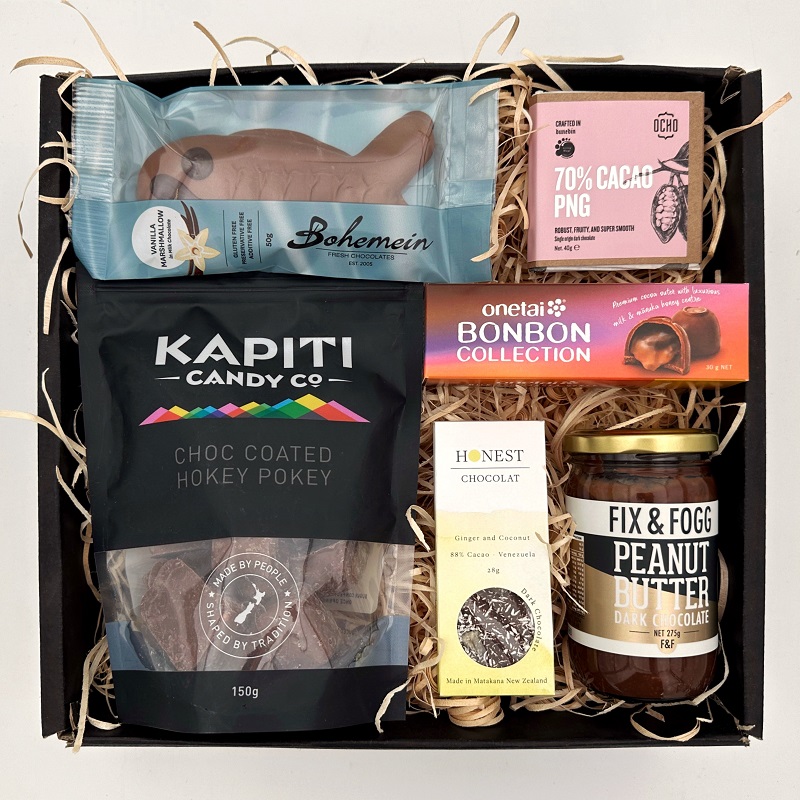 If you're looking for fantastic, local craft chocolate, you're going to love this carefully curated selection of snacks. Treat yourself to a Bohemein chocolate fish, cracking through the thick dark chocolate to get to the sweet marshmallow inside. Or spread a little peanut butter and dark chocolate from Fix & Fogg onto a pancake or pretzel. For the honey lovers, be sure to try Onetai's modest and delicious bonbons or the chocolate-coated Hokey Pokey from Kapiti Candy Co. And for the purists, enjoy simple chocolate bars from Honest Chocolat and Ocho. This box is a real treat for any fan of quality chocolate.