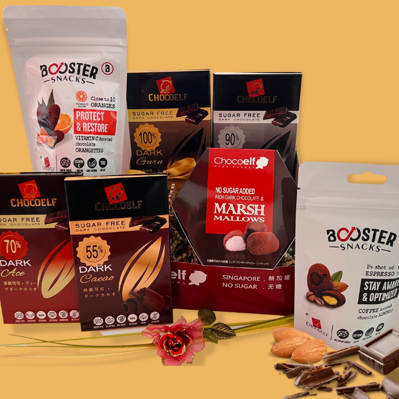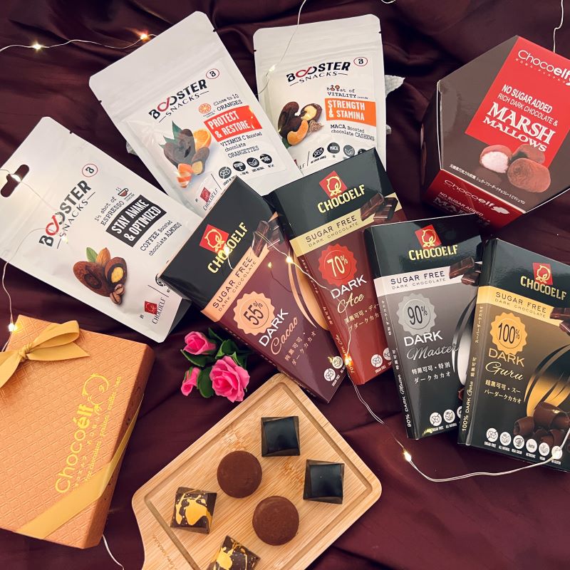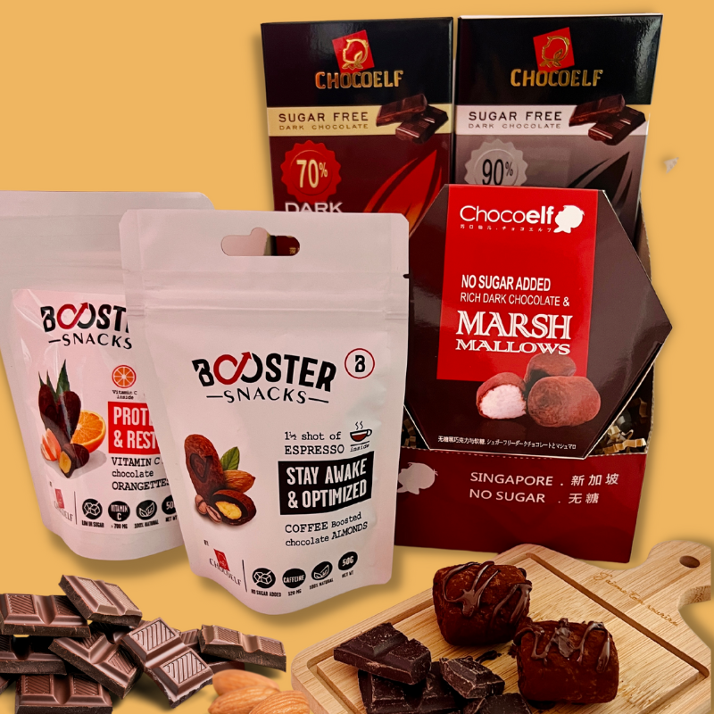 Indulge your senses with this delightful box full of dark chocolate, with no-sugar-added recipes. Inside you will find not only bars of 70% and 90% chocolate but also dark chocolate-covered marshmallows and Booster chocolates that deliver both taste and performance. The most decadently dark selection!