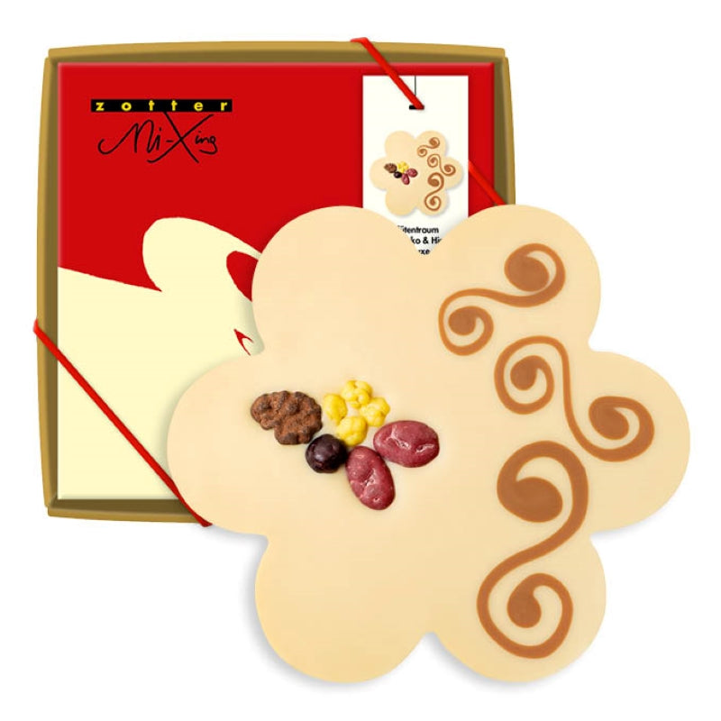 ORGANIC, FAIR & BEAN-TO-BAR. A chocolate flower made with white chocolate and filled with a very berry raspberry mousse decorated with a beautiful milk chocolate pattern. It’s sprinkled with pumpkin seeds coated in raspberry chocolate, crunchy passion fruit, and crispy blueberry chocolate fruit bits, and it comes wrapped in a decorative gift box.