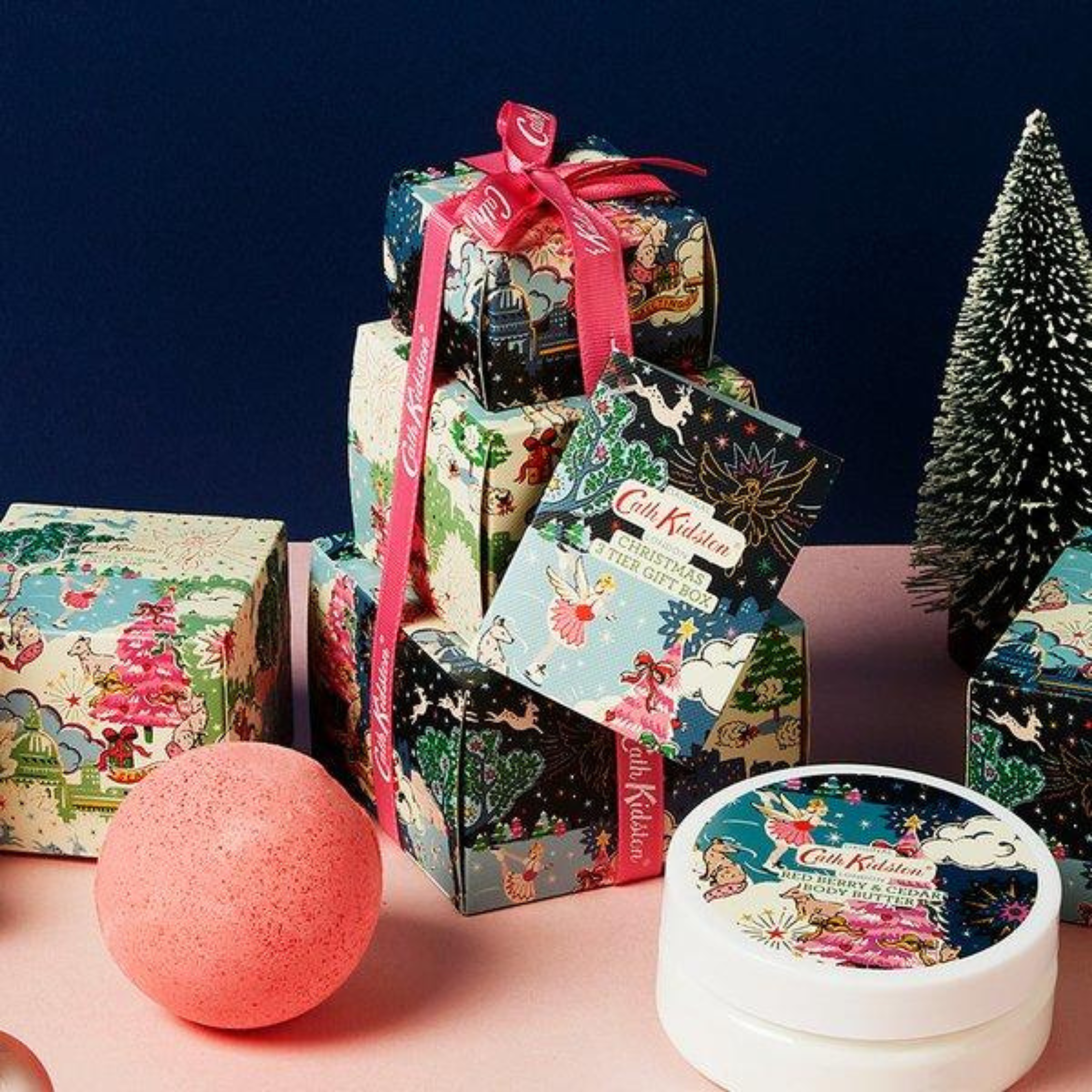 Join in the festive cheer with Cath Kidston's exclusive limited edition holiday collection, perfect for a special Christmas celebration. The set comprises a 3-tier tree gift for hand and body, featuring a 50g red berry and cedar-scented soap, two 40g pieces, a 150g bath bomb, and 150ml of indulgent body butter—all elegantly packaged in a Christmas box.