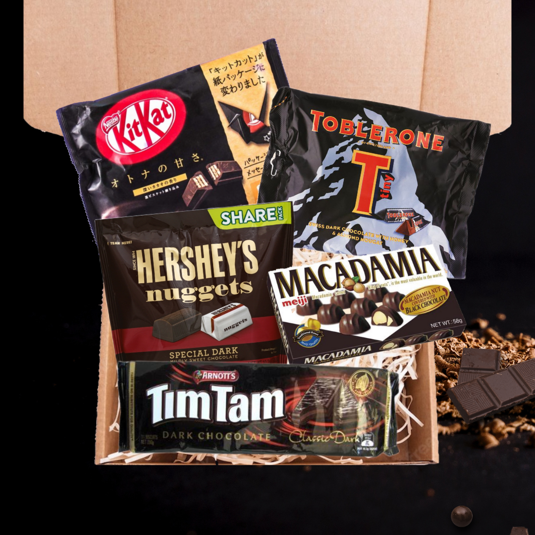 This box offers a great selection of bittersweet high-end chocolates for someone who doesn't like sweets but loves chocolates! Delight yourself with the indulgent taste of Brownies Brownie chips, Cocio dark chocolate mix, Meiji almond black, Royal Belgian chocolate thins, and Storck Riesen dark chocolate chewy toffee. Be thrilled by the bittersweet experience of dark chocolates anytime, anywhere!