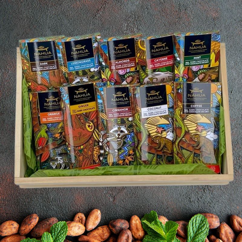 Take a voyage of the origin of Costa Rican cocoa! Ten delightfully dark chocolate bars that contain 70% pure cocoa, made from the finest Costa Rican cocoa beans are waiting for you. This basket features handcrafted Nahua's artisan dark chocolate paired with different flavors; almond, mint, coffee, cinnamon, and many more for you to find out. So complex and smooth, 100% organic and fair trade.