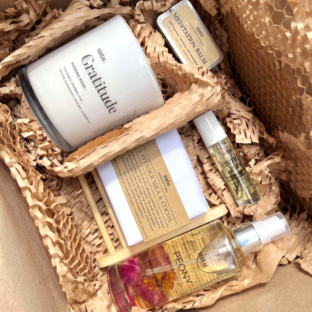 Energy goes where attention flows. Attract what is most often in your heart and what is most powerful in your mind. Get more out of life by practicing gratitude: absorbing, and really paying attention to the good things in life. Enjoy these handcrafted items that include Lavender Coconut Shea & Cocoa Butter soap, Peony body oil, a candle, and a meditation balm to name a few. Change your life and practice your daily gratitude ritual.