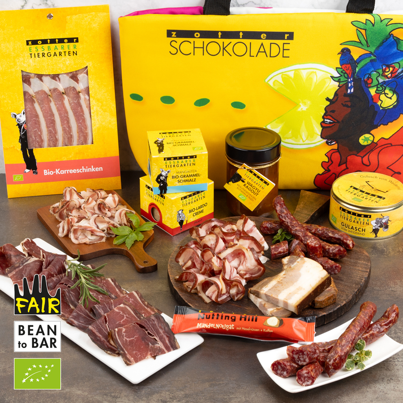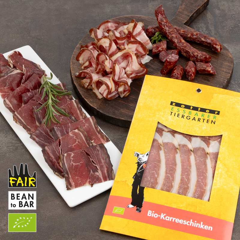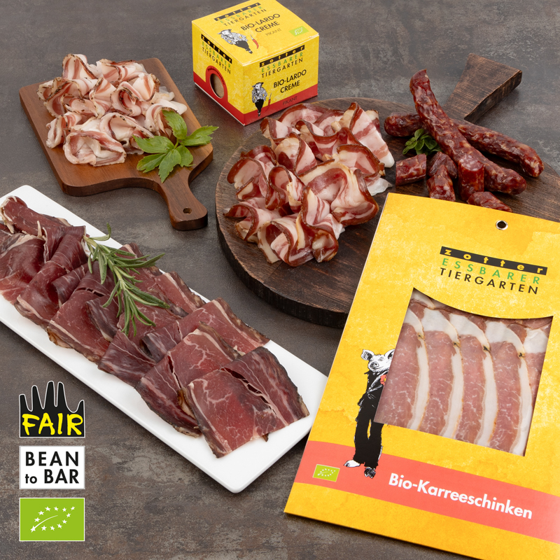 Meat Lovers, this one's for you! This box is filled with excellently hand-crafted organic hams and meaty nibbles: All the meats in this box are thoughtfully crafted and aged by the in-house butcher, made with meat from free-ranging animals living on the family farm. Enjoy a packet of tasty deer salami, air-dried ham of beef, as well as a slightly smoked specialty ham made from woolly pigs raised in the lush forest. A special treat: Hamburg-style bacon, perfect to use in your cooking or just as is! Note: the plate is not part of the box. 100% ORGANIC & FAIR.