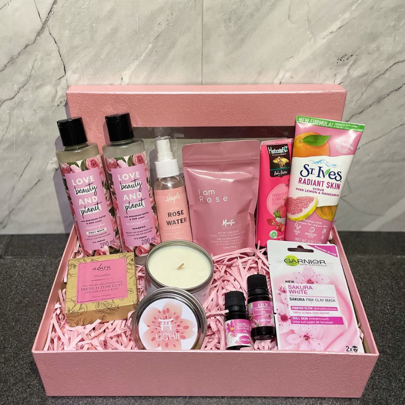 Anything is possible with sunshine and a little pink. Immerse your self with these pretty in pink products to get the feel of romantic spa sensation in your home. You shall find Love Beauty and Planet's body wash and shampoo. St. Ives face scrub, Garnier Sakura white clay mask, and Haple 100% pure rose water for a refreshing and glowing face. Grab this box and enjoy these lovely self care products!