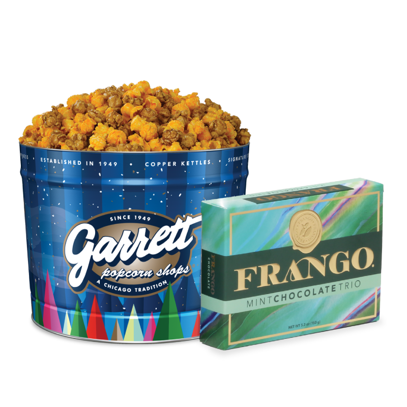 Their Family tin of Garrett Mix paired with a 15pc Frango Chocolate Mint Trio
