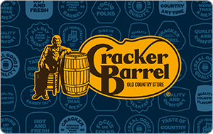This card is offered by Cracker Barrel Old Country Store, Inc. and may be applied toward the purchase of goods or services at any Cracker Barrel Old Country Store® location. Not usable to purchase gift cards. Except where required by law, this card will not be redeemable for cash or credit, nor replaced if lost or stolen. Visit crackerbarrel.com for complete terms and conditions. For balance inquiries, see cashier, check your receipt, call 1-866-604-1011, or visit crackerbarrel.com.