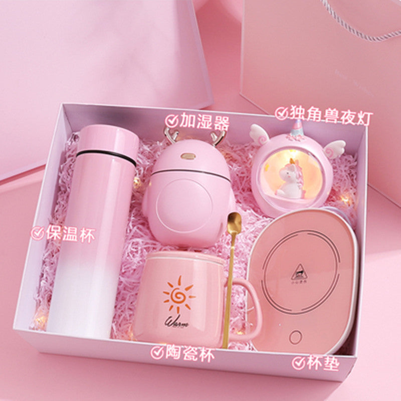 This box creates your lovely workspace into a pink world. This gift box includes a gradient pink vacuum cup keeping the temperature for over 10 hours, an Antler humidifier to let the air no longer dry, a gentle sound humidifier that will accompany you to have a good sleep, and a unicorn night light to brighten your room majestically. Get yourself or your loved one a box with pink properties inside.