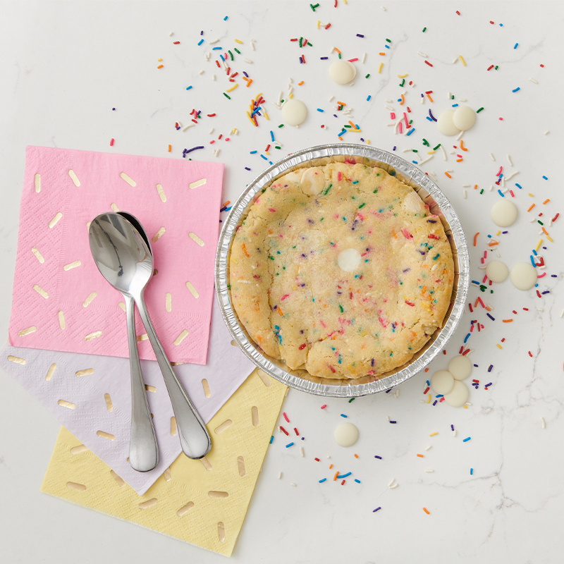 Includes six (6) frozen, ready-to-bake celebration sprinkle cookie skillets, with rainbow sprinkles and white chocolate
