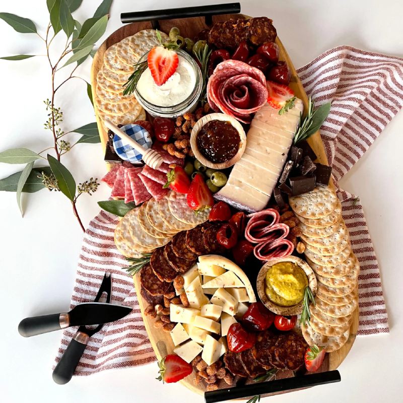 3+ other accompaniments (dried fruits, olives, candied nuts, chocolate, pickled things, etc.) + Large Wooden 11x17 Platterful charcuterie board